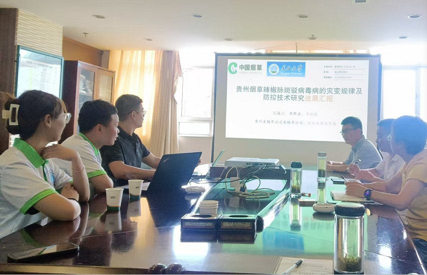 接下来队员们先后在西秀区杨武乡、双堡镇、宁谷镇,平坝区十字回族苗族乡的烟田对烟草叶片进行采样,并现场运用所学的病毒检测技术以及伟德bv1946官网病毒学研究团队与安顺市烟草公司技术中心联合开发的病毒检测新产品进行了烟草花叶病毒和辣椒脉斑驳病毒的病毒检测,检测结果显示大部分烟草植株携带烟草花叶病毒以及辣椒脉斑驳病毒,这同时也印证了双方共同研发的病毒检测试纸条的灵敏度和准确度。在实地测验之后,章教授团队与相关负责人进行了正式的会议座谈,详细汇报了项目进展,正式展示包括烟草病毒检测试纸条、病毒检测卡、ELISA试剂盒等项目创新成果并汇报项目后续的工作安排。与会烟草公司相关负责人对伟德bv1946官网承担的烟草科技攻关项目进展及成果表示认可,同时也提出部分例如具体落实、推广方面细节及病毒病早期预防和防治等问题的意见和建议,经过与烟草公司的洽谈,双方最终顺利达成深入合作的意愿。