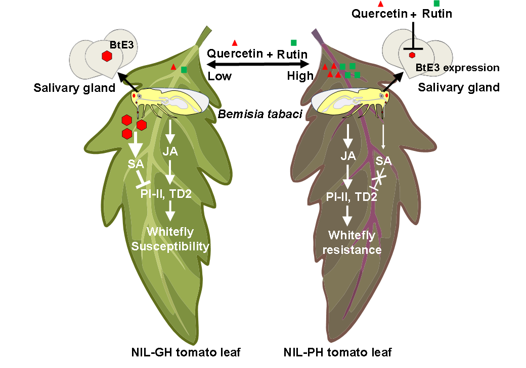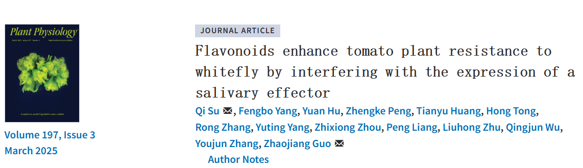 近日,伟德bv1946官网苏奇团队和中国农业科公司蔬菜花卉研究所张友军团队在Plant Physiology上发表题为Flavonoids enhance tomato plant resistance to whitefly by interfering with the expression of a salivary effector的研究论文,揭示了防御性次生代谢物类黄酮(槲皮素和芦丁)增强番茄对烟粉虱抗性的分子机制,该研究揭示了槲皮素和芦丁在番茄防御烟粉虱中的关键作用和调控机制。