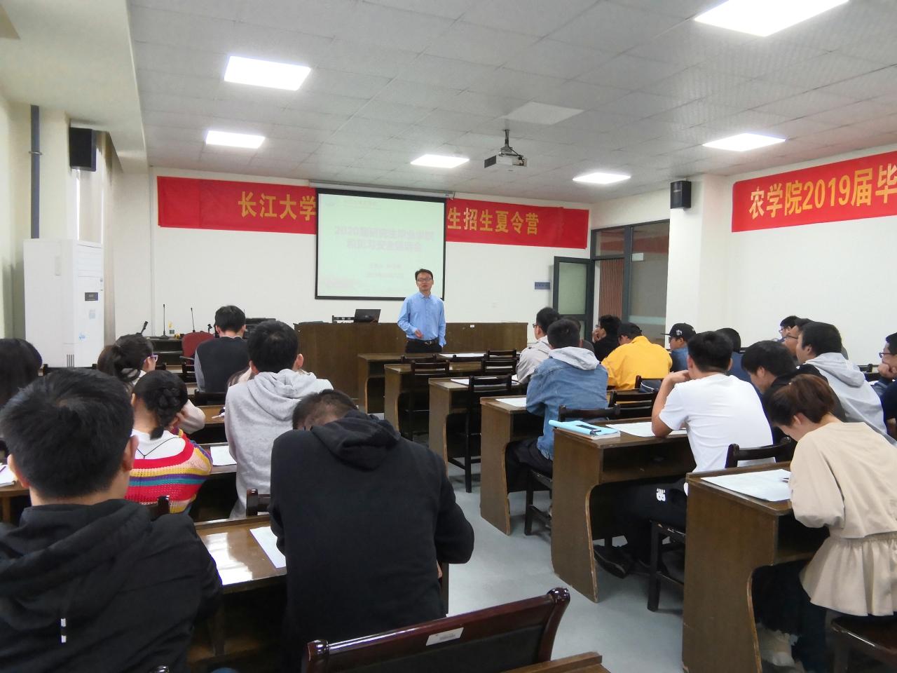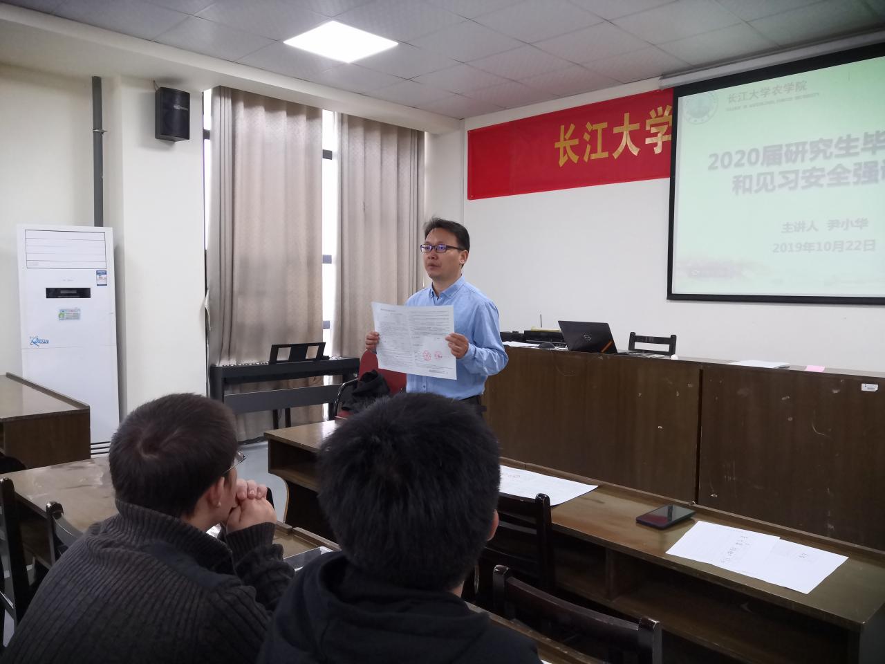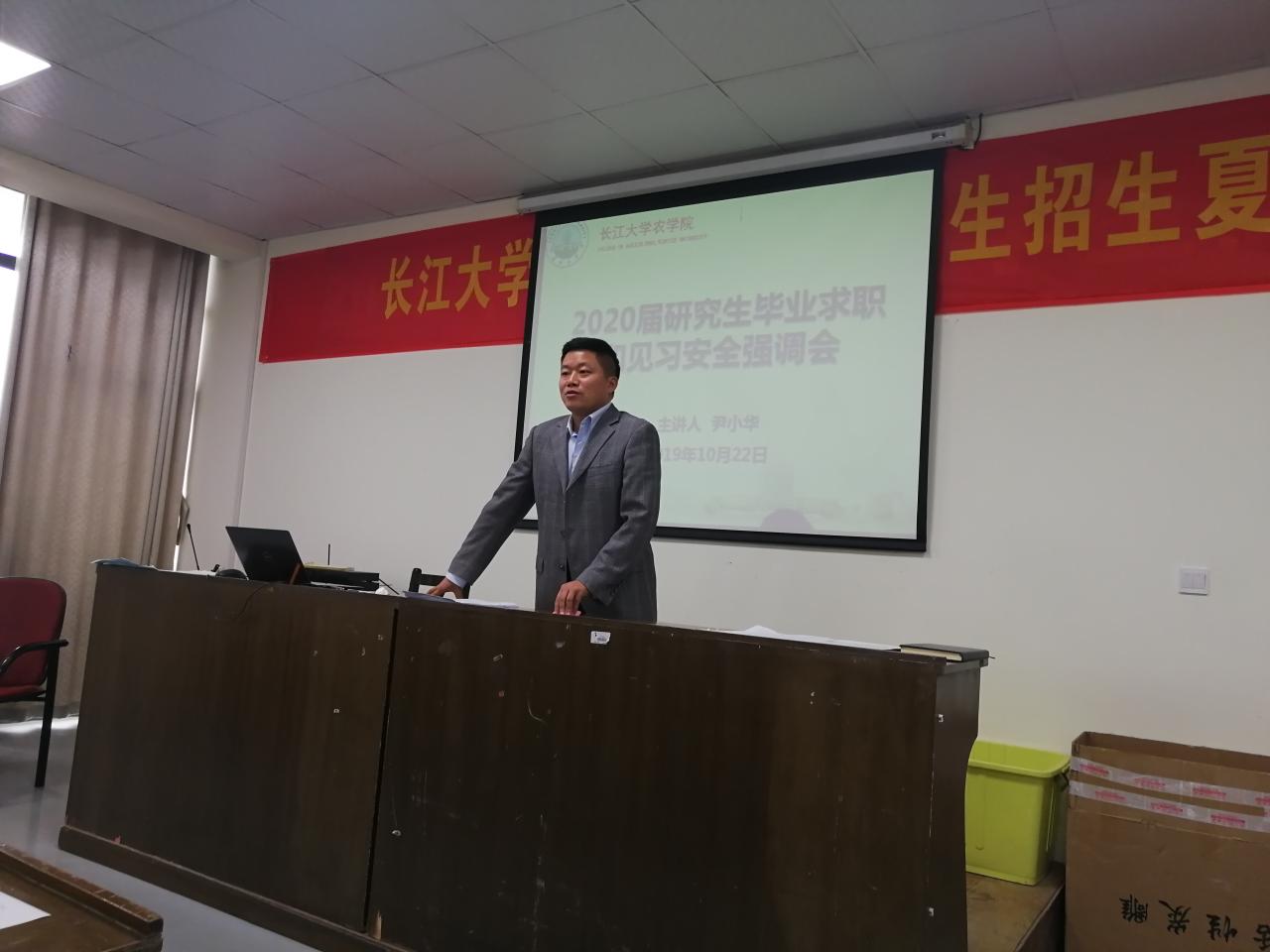 紧接着,团委书记尹小华老师为毕业生们讲解就业协议的签订,他强调了与企业签约对保护同学们合法权益的重要性,提醒大家警惕各种求职陷阱。同时,尹老师介绍了本月25号即将在公司举办的2020届农科类专场招聘会,鼓励大家携带简历积极参与,多了解,多尝试,在不同的面试中积累和总结经验。他还为考博的同学们送上嘱咐,希望大家坚定信心,为向更高的平台冲刺而不懈努力。