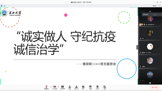 本次主题教育活动紧密围绕“做人、抗疫、治学”等老员工事务,将“诚信”理念贯穿其中,引发各班级的纷纷响应和热烈讨论。植物类31902班通过“腾讯会议”平台开展了此次班会。班长亢凯同学在会前召集了全班员工,并邀请班主任邓锋林老师参会。会上,主讲人李麟政给同学们普及了生源地助学贷款的相关事宜,讲解了疫情期间的防护措施和需要注意的问题,并着重强调了诚信的作用。活动中,每个同学都积极认真地参与进来,表现出了对诚信问题的高度关注,希望能做诚实之人、守纪之人。植保职31801班也积极参与到了主题活动中。首先由主持人杨姝祺同学说明此次活动背景,并播放教育部考试中心录制的《教育部诚信考试宣传片》。该视频以青蛙为角色,公司为背景,生动形象地阐述了违纪作弊、违法考试的处理方式。最后,同学们积极交流自己的观影感想,罗亚君同学感慨道:“我们要以视频为本延伸至每一次考试,目前临近期末,希望大家都能认真复习,以诚信、自身实力考出不俗的成绩。”