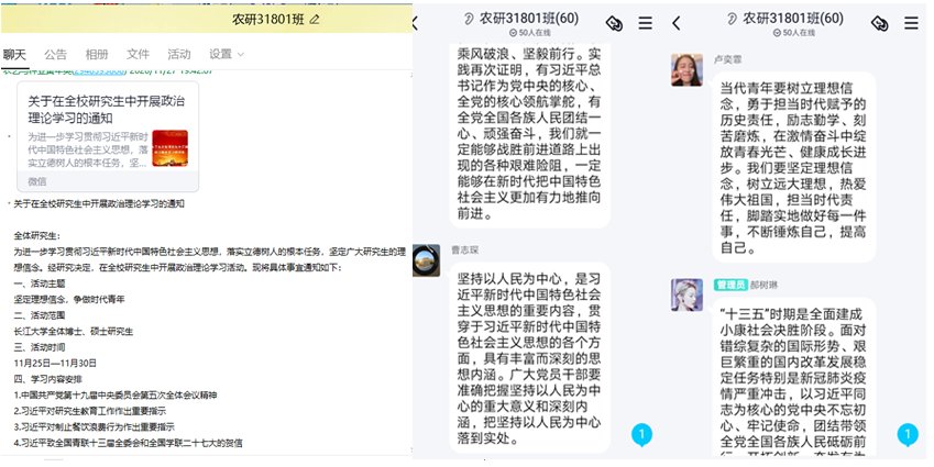 政治理论学习全覆盖,一个也不能落、一个也不能少。各班级通过线上、线下相结合的方式,诵读了理论知识读本、展播PPT图文素材、观看新闻视频、抢答问题、开展讨论等,重点学习了 “中国共产党第十九届中央委员会第五次全体会议精神”等政治理论学习系列内容。
