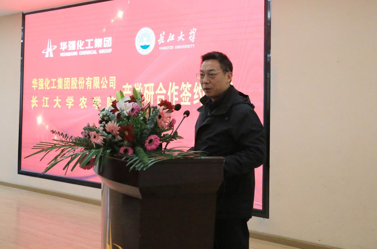 庞占岭副董事长代表公司致欢迎词,他代表公司对李俊凯经理一行的到来表示热烈的欢迎,并介绍了华强化工集团股份有限公司的发展历程、主营产品、经营情况以及发展规划,公司通过科研创新以及企业改革,已经发展成行业领军企业。他说,公司与伟德bv1946官网开展产学研合作,必将实现“产教融合、资源互补、产学共赢”的目标。