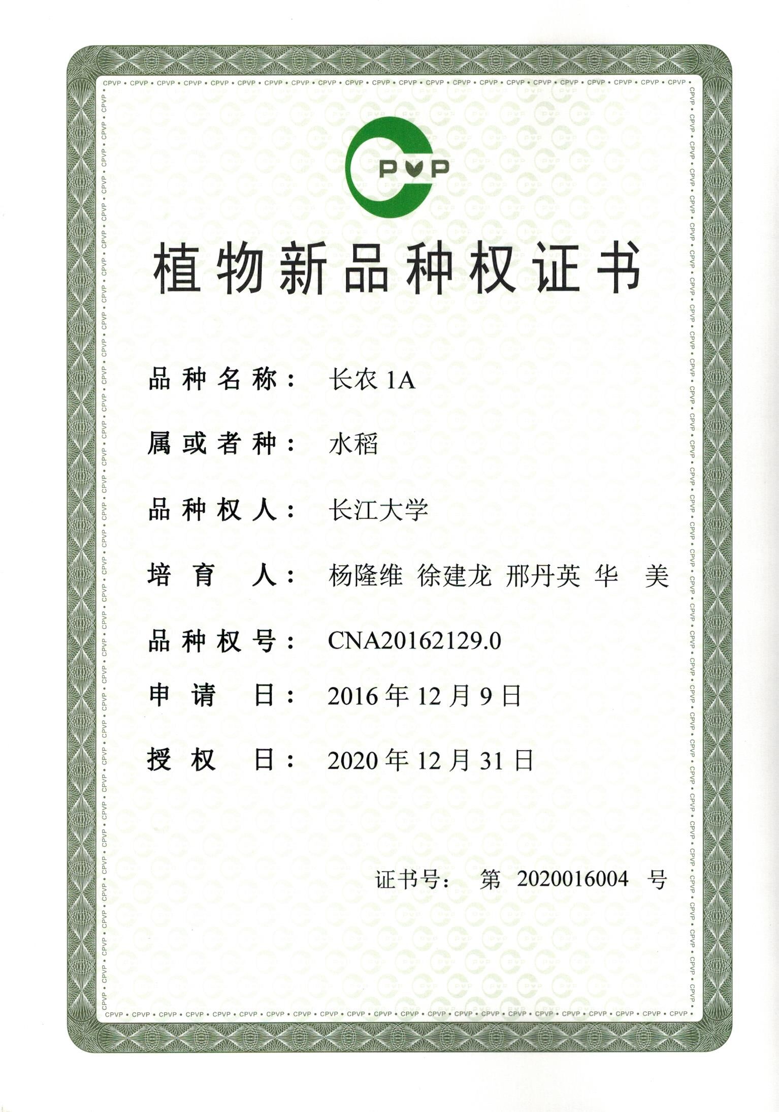 (通讯员 谭亮魁)3月29日,伟德bv1946官网收到一份植物新品种保护权证书,伟德bv1946官网育成的三系杂交水稻新不育系长农1A正式获批农业部植物新品种保护权,品种权号为:CNA20162129.0。该不育系培育人为伟德bv1946官网杨隆维教授、长大学者徐建龙特聘教授和邢丹英教授等。