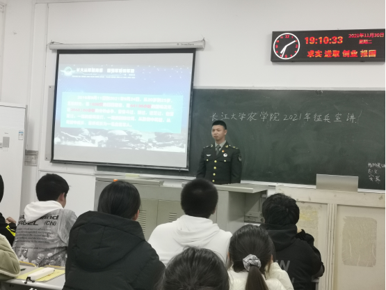 刘庆老师介绍了本次征兵的主要日程安排、进站体检的相关待遇以及入伍的优待政策,他号召同学们积极响应国家政策,投身国防事业。