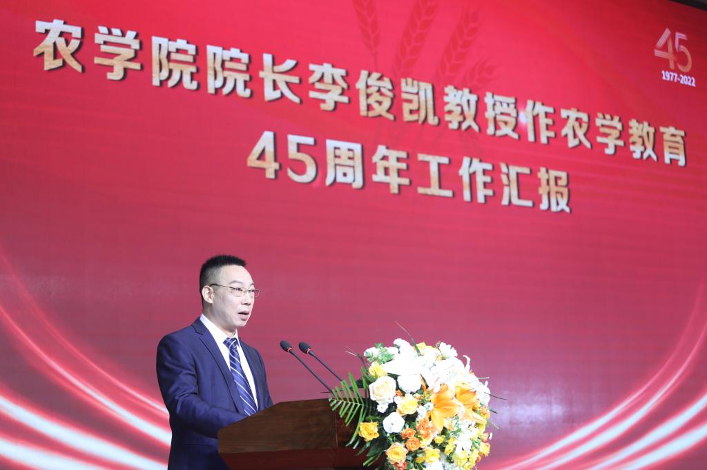 伟德bv1946官网经理李俊凯作农学教育45周年工作汇报。他从“感恩心、冲天劲、尚农情”三个方面全面系统地总结了农学教育45年来在团队队伍建设、团队建设与研究生教育、专业建设与人才培养、科学研究与社会服务、公司治理与文化建设等方面取得的丰硕成果。