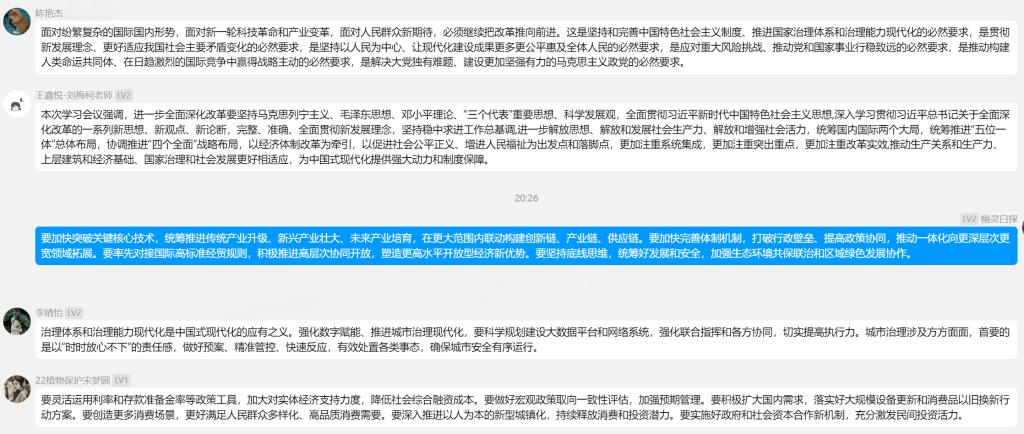 本次活动重点学习了“习近平在重庆考察时强调,进一步全面深化改革开放,不断谱写中国式现代化重庆篇章”、“习近平总书记关于党的纪律建设的重要论述”以及“湖北省科学技术进步条例”等内容。学习过程中,同学们结合自己在校的学习状况,畅所欲言,分享心得。农研2303班蔡露表示,研究生应当树立远大目标,积极参加科研项目和实践创新,保持对科研的热情和初心,争做新时代好青年。