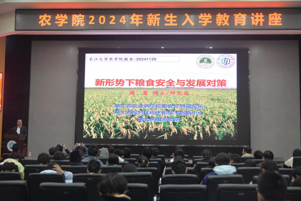 (见习记者 郑怡乐/文 吴静宜/摄)为加深新生对农科专业的认知,了解专业未来发展的方向,11月20日晚7点,公司于农科大楼1058进行了“新形势下粮食安全与发展对策”主题讲座。本讲座由中国青年五四奖章获得者、湖北省农业科公司粮食作物研究所研究室主任、研究员周雷进行报告,由公司党委副书记尹小华主持。伟德bv1946官网副经理张运波、农学系朱波教授、邱先进教授及2024级全体本科生出席本次讲座。