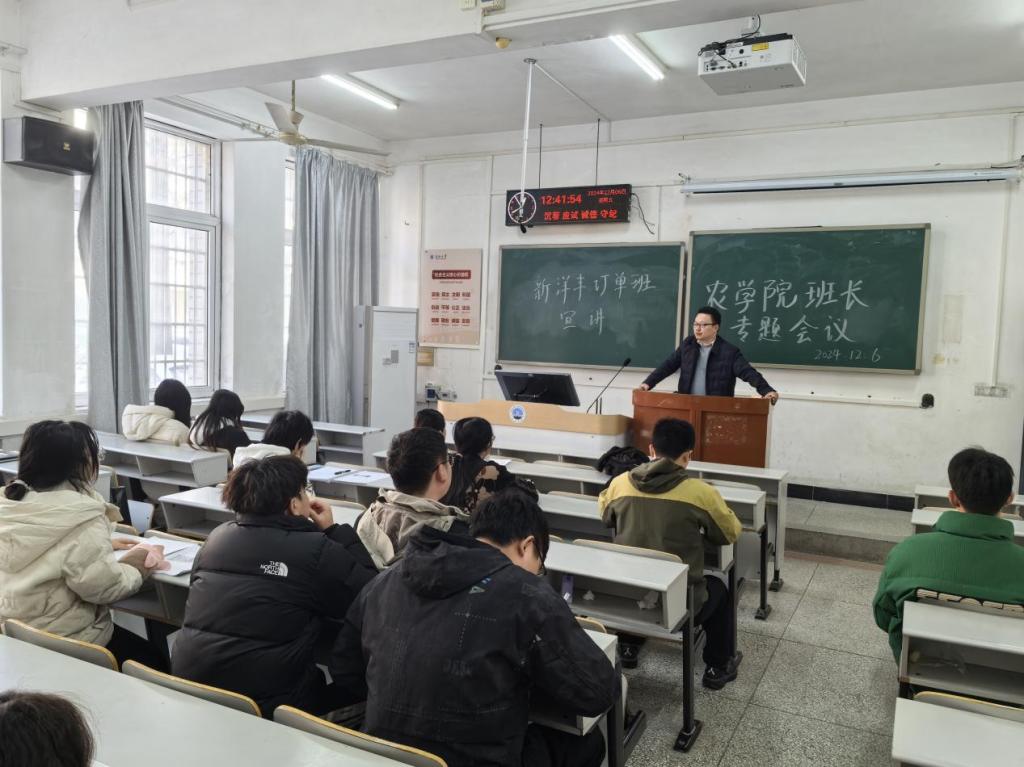 针对新洋丰订单班的宣讲。新洋丰是一家知名的农业企业,此次与公司合作开展订单班,旨在培养具有专业技能和实践经验的农业人才,提供企业实习、就业等机会。公司鼓励同学们积极参与订单班的选拔,为自己的职业规划打下坚实基础。订单班不仅为同学们提供了优质的学习资源和就业机会,还能够帮助同学们更好地了解行业趋势和市场需求,为未来的职业发展指明方向。各班级班长也表示,将积极向同学们传达订单班的相关信息,鼓励符合条件的同学积极参与选拔。