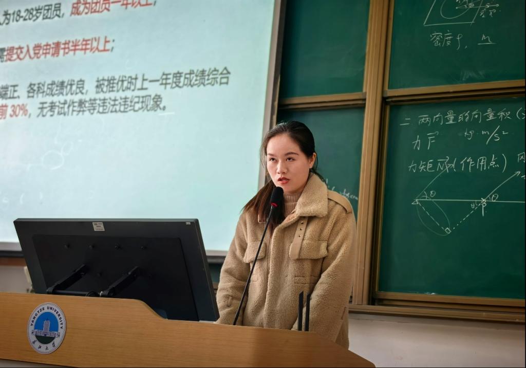 付雪娇老师首先对本次推优工作的改革方案及推优申请人条件做了详细的介绍。她指出,此次推优工作既要确保质量,也要注重公开透明,让更多优秀学子加入中国共产党的队伍中来。各班级团支部副书记应当本着严谨、公正的态度认真负责此次推优工作。按照推优条件,申请人需要在学习、工作、社会实践、组织能力等各方面有出色表现,并获得班级和院系的一致认可。