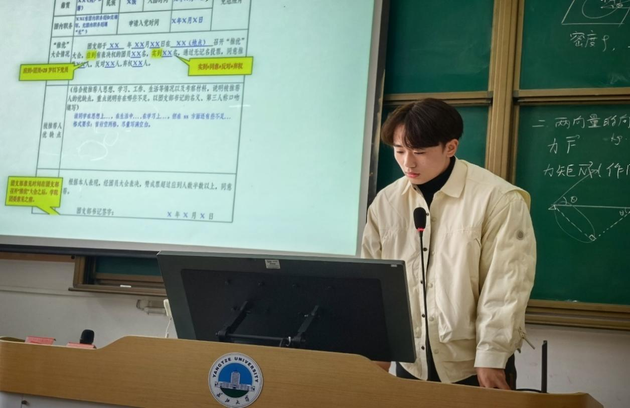 在付雪娇老师的讲解后,组织部部长蒋云霖为参会人员补充讲解了共青团伟德bv1946官网委员会推荐入党积极分子申请表的填写注意事项。他强调,申请表要如实填写,重点突出个人事迹,切忌夸大其词。同时,申请人还需要提供相关证明材料,如获奖证书、社会实践证明等,以佐证自己的先进事迹。