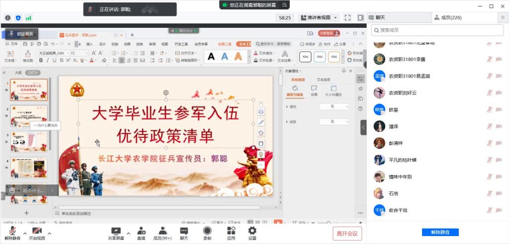 通讯社讯(见习记者 李雨珈/摄 刘金城/文)为鼓励应届毕业生响应国家号召,积极投身到保卫祖国的神圣事业。5月26日,伟德bv1946官网组织大学毕业生应征入伍线上宣讲活动,宣讲会由伟德bv1946官网征兵宣讲员刘金城、郭聪两位退役士兵主讲。分党委副书记尹小华、辅导员林香亮、2022届全体毕业生线上参加此次宣讲。