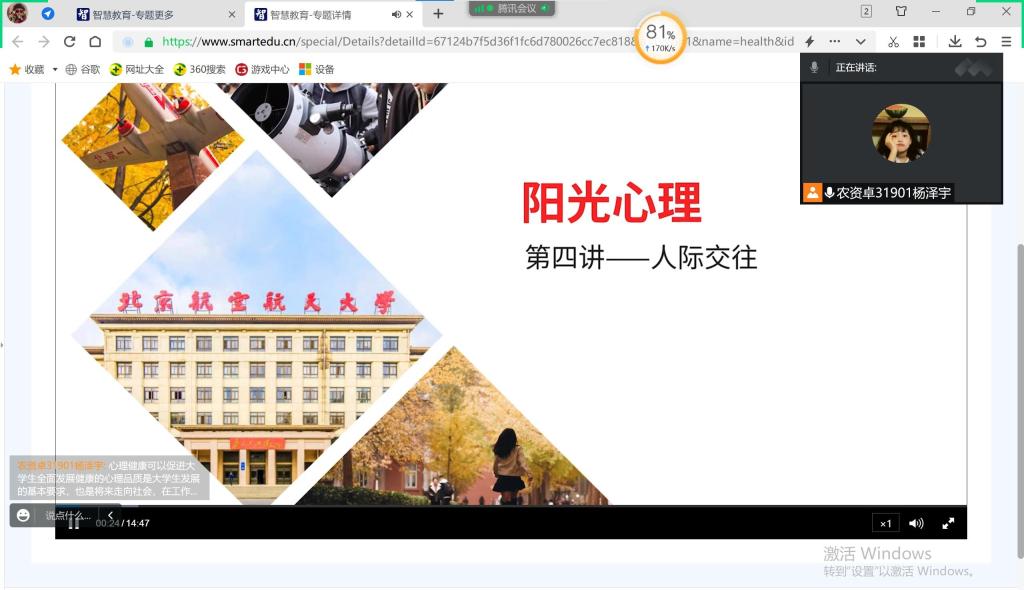 本次学习采取线上线下一起进行的形式,每班自由选择活动形式,在各班心育委员的主持下进行。微课视频中的学习分别从阳光心理、调控情绪、心理育人三个方面进行。在心理微课视频中,提供了关于压力的释放,如何处理焦虑等心理生活问题的可靠解决方案。微课中提到:“认识自我是深层的内在需求,有利于实现自我价值。”大家通过观看视频,表示要针对班级实际情况,正确认识自我状态,调整自我,做到实现自我价值。