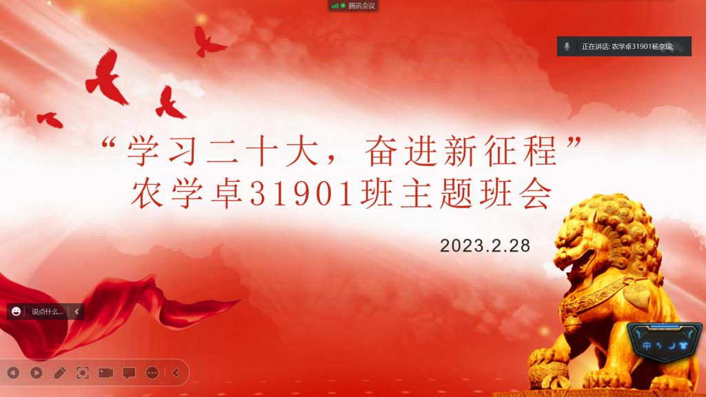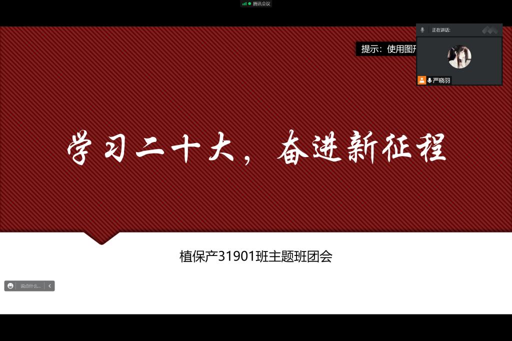 植保卓32001班班长围绕“爱国、团结、奋斗、科学、互助”五个关键词,以学习贯彻党的二十大精神为契机,在班内召开了“学习二十大,奋进新征程”主题班会。班会结束后,同学们纷纷表示对党的二十大精神有了更加深刻的认识,同时提升了爱国热情,激发了学习动力。