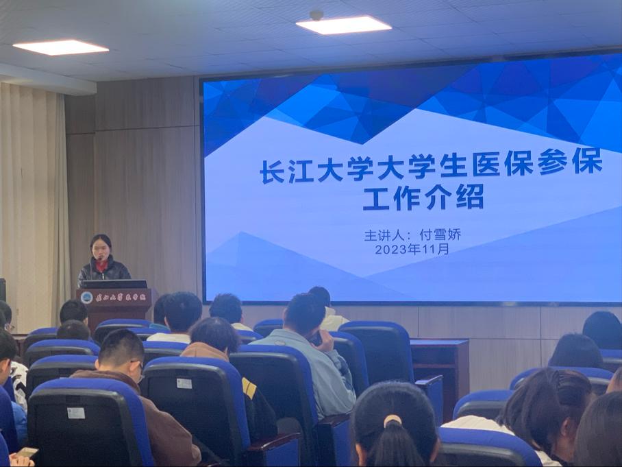 分团委书记付雪娇用简洁准确的语言分别从“老员工参保原因”、“老员工医保缴费及待遇”、“老员工医保与学平险”、“在校参保与在家参保”、“新老生参保缴费相关问题”与“老员工参保现状”6个方面向同学们进行讲解。其中着重讲解了“老员工医保缴费及待遇”、“新老生参保缴费相关问题”,让同学们了解到可以进行医保报销的情况、报销类别的选择、报销流程及一般报销比例等相关政策和知识。