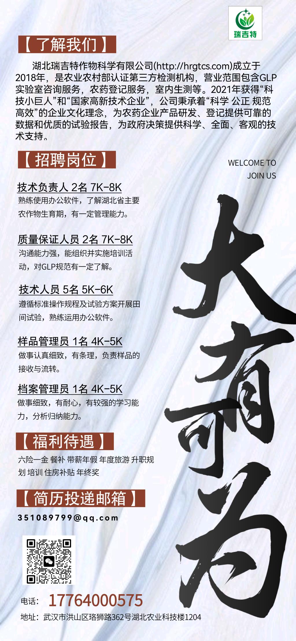 湖北瑞吉特作物科学有限公司(Hubei Register Crop Science Co. Ltd)成立于2018年10月,是一家具有独立法人资格,提供GLP实验室建设、农药登记等咨询服务、从事农药室内活性及安全性测定、抗性风险评估、农药田间药效和农作物残留、环境影响、各类农药示范活动策划与实施等田间试验的第三方试验机构。