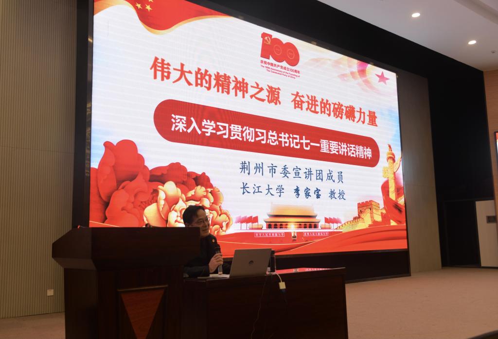 通讯社讯(通讯员 李慧明/摄 李雅倩/文)为贯彻落实习近平总书记在庆祝中国共产党成立100周年大会上的重要讲话精神,11月10日晚,公司原任副董事长、荆州市委宣传部讲师团首批特聘专家李家宝教授与伟德bv1946官网师生面对面,宣讲了习近平总书记“七一”重要讲话精神,报告会由公司党委副书记谭亮魁主持。