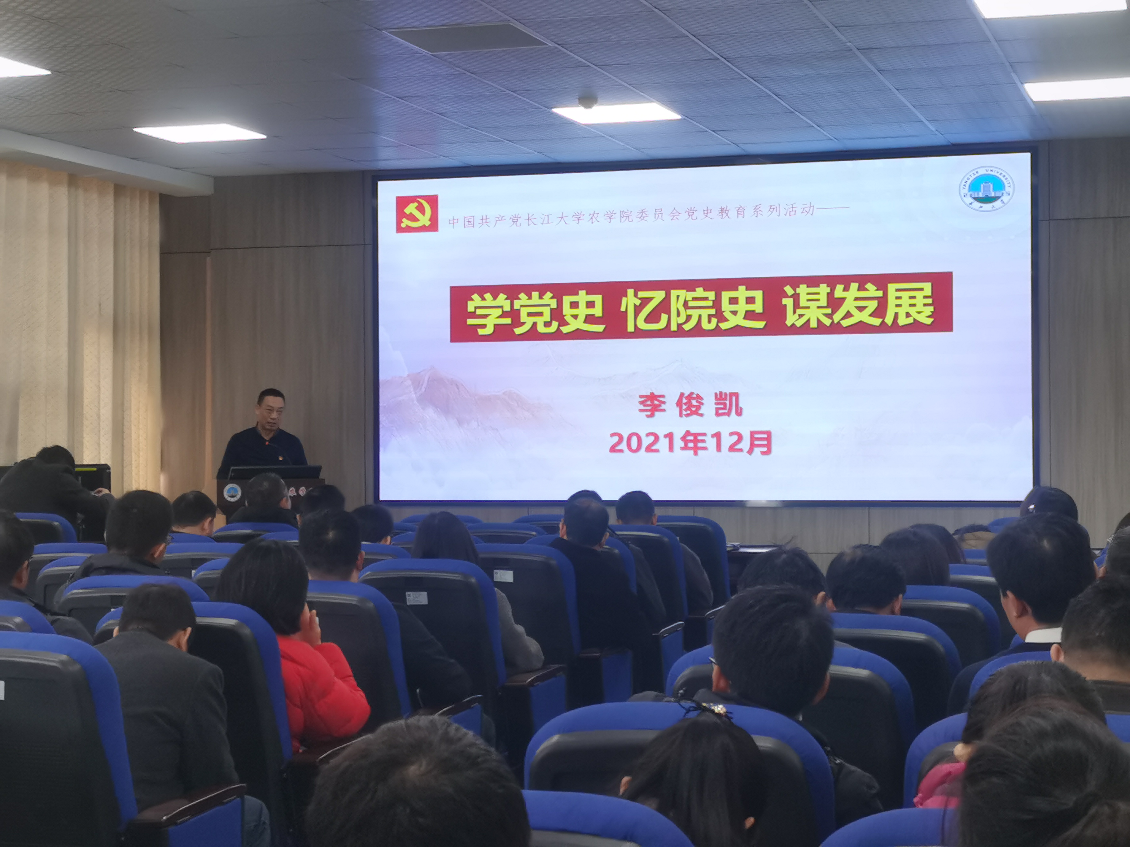 12月2日下午,在农科大楼3073会议室,伟德bv1946官网经理李俊凯以《学党史 忆院史 谋发展》为题,为全院教职工上了一堂生动的党课。