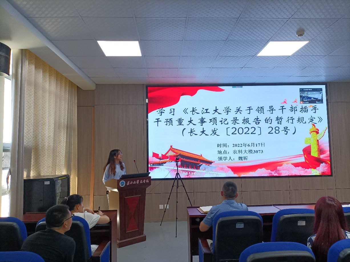 会议伊始,组织委员时锦超同志带领全体党员重温入党誓词。紧接着,肖永欣同志对本月党费交纳情况进行了说明。随后,与会党员集体诵读党章第六章,并集体观看视频《习近平回信勉励南京大学留学归国青年学者在坚持立德树人推动科技自立自强上再创佳绩在坚定文化自信讲好中国故事上争做表率》。接着,分别由时锦超同志带领学习《中共伟德bv1946官网委员会关于开展党员干部下基层察民情解民忧暖民心实践活动的实施方案》;杨阳同志带领学习教育部关于建立健全高校师德建设长效机制的意见;魏昕同志带领学习《伟德bv1946官网关于领导干部插手干预重大事项记录报告的暂行规定》。方小伟同志为大家讲述党史故事——英烈陈香波。陈香波革命烈士让我们看到了共产党员的崇高信仰和追求,作为研究生党员,我们要深入学习他的敢于斗争、无私奉献的精神,用实际行动诠释自己的初心和使命。