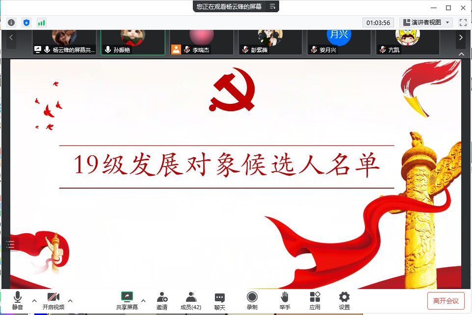 (通讯员 亢凯)为进一步加强农公司党员队伍建设,切实提高发展党员质量,10月14日上午9:00,公司本科生员工党支部在腾讯会议召开2022年下半年党的发展对象候选人讨论。活动由本科生员工党支部副书记唐海洋同志主持,本科生员工党支部书记杨云锋同志和全体本科生党员参加了讨论会。